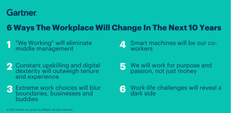 💡 Dzisiaj spojrzenie firmy Gartner i ich obraz zmian, które czekają miejsca pracy w ciągu kolejnych 10 lat. Wymieniają 6 głównych obszarów. Niektóre z nich są nam już dobrze znane i dość powszechnie omawiane jak chociażby: