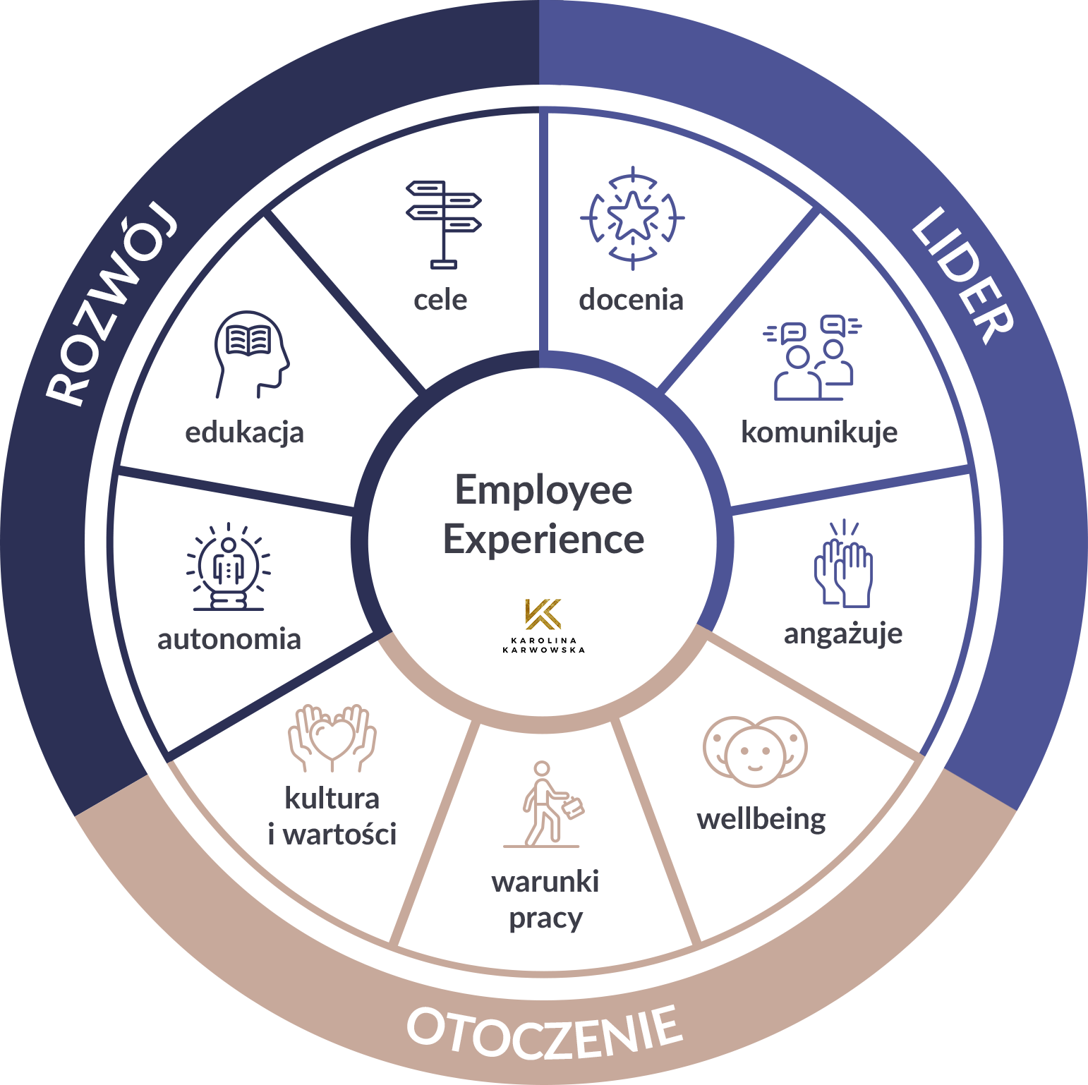 Każdy z tych filarów, wewnątrz kręgu ma po trzy obszary. Te obszary mogą być dopasowane do Waszej organizacji i wynikać z jej specyfiki i potrzeb. Ważne jest jednak, aby były one dobrze zidentyfikowane, a nie zgadywane. Jak je wykryć? Pytając po prostu pracowników, bo to przecież ma być model, który działa dla nich: ich zaangażowania, efektywności i zadowolenia.