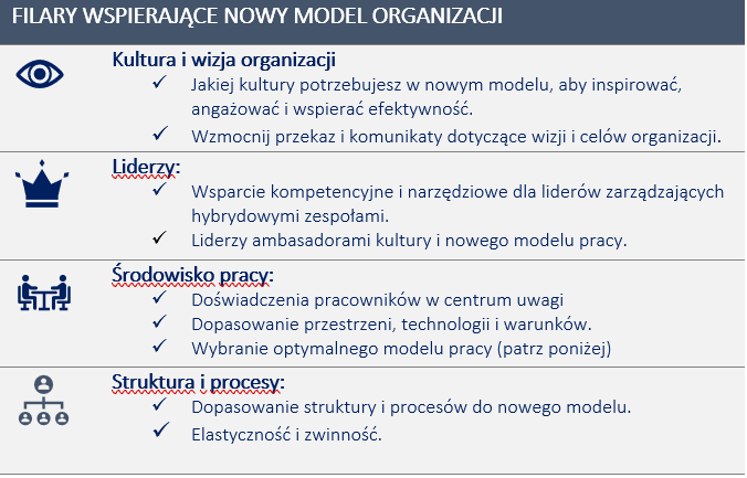 Przeprowadź analizę modelu organizacji przed i po pandemii opierając się na 4 kluczowych blokach: