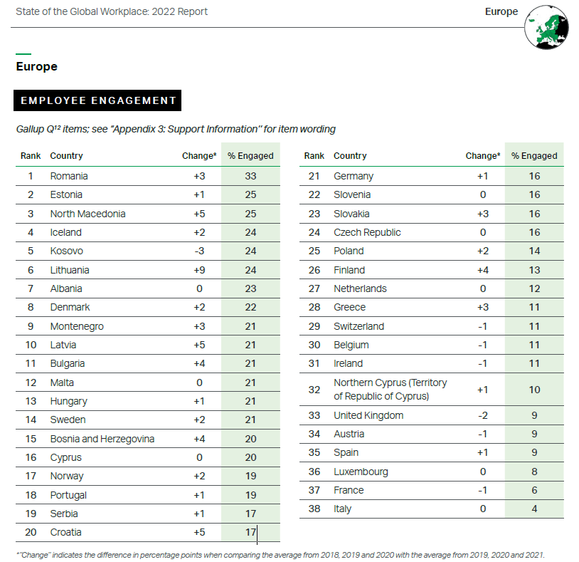 Według najnowszego raport Instytutu Gallupa „State of the Global Workplace: 2022 Report” tylko 14% Europejczyków jest zaangażowanych w pracę. To najniższy poziom notowany na świecie. Dla porównania z USA, gdzie poziom zaangażowania jest najwyższy na świecie różnica jest aż 19 punktów.