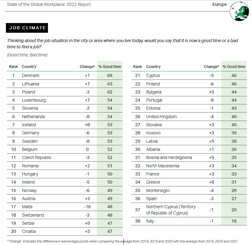 Natomiast aż 62% pytanych Polaków uważa, że obecne czasy sprzyjają znajdowaniu dobrej pracy. Plasujemy się w tych opiniach na 3 miejscu w Europie, zaraz po Danii i Łotwie. To bardzo obiecujący i ciekawy wynik.