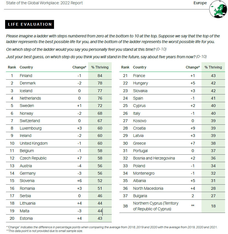 Europejczycy wysoko oceniają jakość swojego życia. Raport „World Happiness Report” wymienia aż 8 europejskich krajów wśród najszczęśliwszych miejsc do życia na świecie. Gorzej jest z pracą. Europejczycy generalnie są zadowoleni ze swojej pracy, ale nie są w nią zaangażowani.
